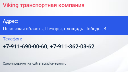 Viking, транспортная компания по адресу Псковская область, Печоры, площадь Победы, 4 в дальнейшем Организация, размещена в следующих категориях: