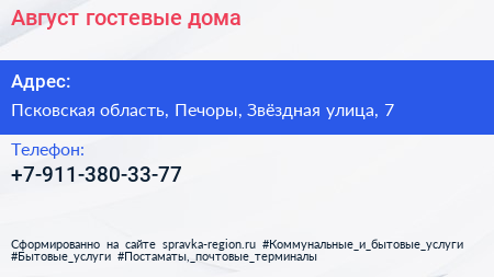 Август, гостевые дома по адресу Псковская область, Печоры, Звёздная улица, 7 в дальнейшем Организация, размещена в следующих категориях: