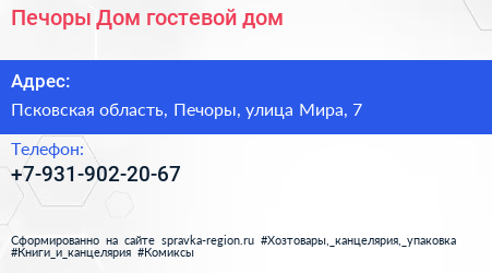 Печоры-Дом, гостевой дом по адресу Псковская область, Печоры, улица Мира, 7 в дальнейшем Организация, размещена в следующих категориях: