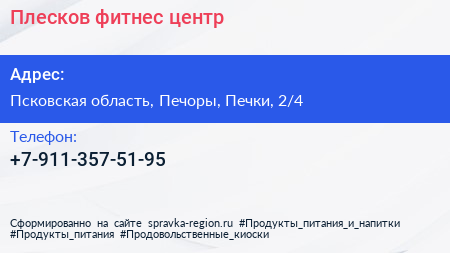 Плесков, фитнес-центр по адресу Псковская область, Печоры, Печки, 2/4 в дальнейшем Организация, размещена в следующих категориях: