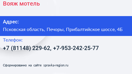 Вояж, мотель по адресу Псковская область, Печоры, Прибалтийское шоссе, 4Б в дальнейшем Организация, размещена в следующих категориях: