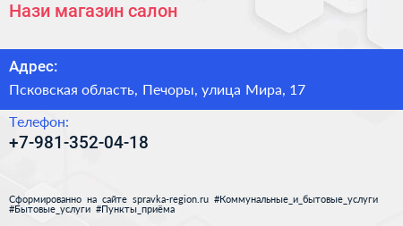 Нази, магазин-салон по адресу Псковская область, Печоры, улица Мира, 17 в дальнейшем Организация, размещена в следующих категориях: