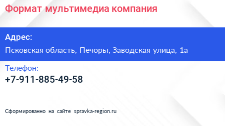 Формат мультимедиа, компания по адресу Псковская область, Печоры, Заводская улица, 1а в дальнейшем Организация, размещена в следующих категориях: