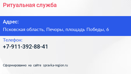 Ритуальная служба по адресу Псковская область, Печоры, площадь Победы, 6 в дальнейшем Организация, размещена в следующих категориях: