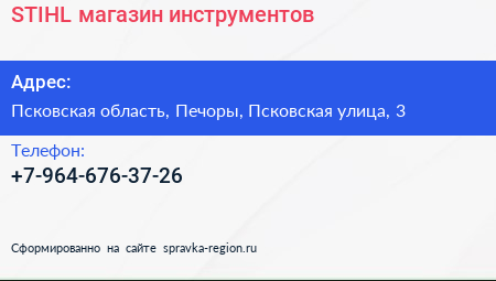 STIHL, магазин инструментов по адресу Псковская область, Печоры, Псковская улица, 3 в дальнейшем Организация, размещена в следующих категориях: