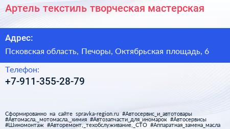 Артель-текстиль, творческая мастерская по адресу Псковская область, Печоры, Октябрьская площадь, 6 в дальнейшем Организация, размещена в следующих категориях: