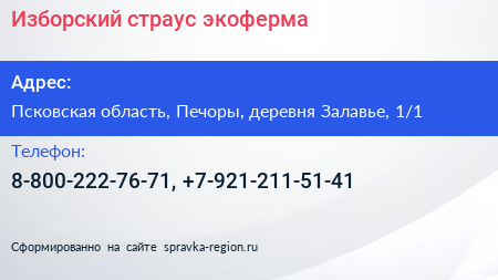 Изборский страус, экоферма по адресу Псковская область, Печоры, деревня Залавье, 1/1 в дальнейшем Организация, размещена в следующих категориях: