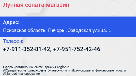 Лунная соната, магазин по адресу Псковская область, Печоры, Заводская улица, 1 в дальнейшем Организация, размещена в следующих категориях: