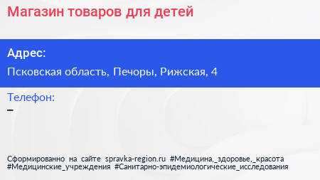 Магазин товаров для детей по адресу Псковская область, Печоры, Рижская, 4 в дальнейшем Организация, размещена в следующих категориях: