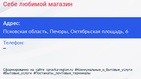 Себе любимой, магазин по адресу Псковская область, Печоры, Октябрьская площадь, 6 в дальнейшем Организация, размещена в следующих категориях: