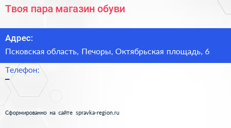 Твоя пара, магазин обуви по адресу Псковская область, Печоры, Октябрьская площадь, 6 в дальнейшем Организация, размещена в следующих категориях: