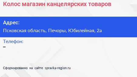 Колос, магазин канцелярских товаров по адресу Псковская область, Печоры, Юбилейная, 2а в дальнейшем Организация, размещена в следующих категориях: