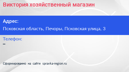 Виктория, хозяйственный магазин по адресу Псковская область, Печоры, Псковская улица, 3 в дальнейшем Организация, размещена в следующих категориях: