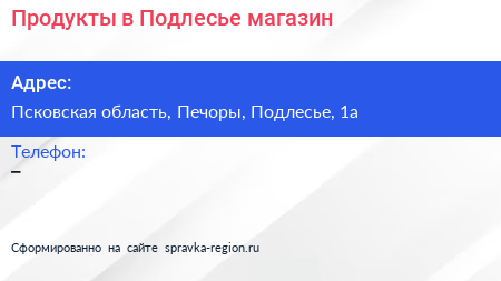 Продукты в Подлесье, магазин по адресу Псковская область, Печоры, Подлесье, 1а в дальнейшем Организация, размещена в следующих категориях: