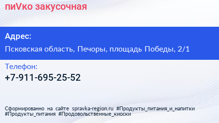 пиVкo, закусочная по адресу Псковская область, Печоры, площадь Победы, 2/1 в дальнейшем Организация, размещена в следующих категориях: