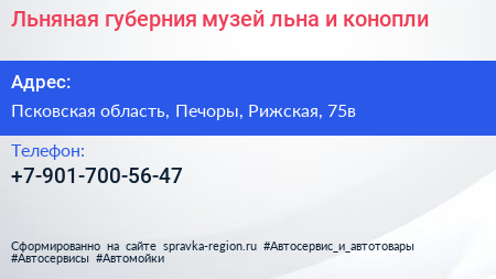 Льняная губерния, музей льна и конопли по адресу Псковская область, Печоры, Рижская, 75в в дальнейшем Организация, размещена в следующих категориях: