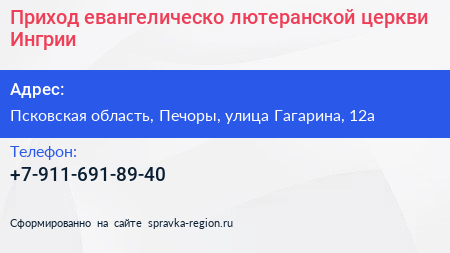 Приход евангелическо-лютеранской церкви Ингрии по адресу Псковская область, Печоры, улица Гагарина, 12а в дальнейшем Организация, размещена в следующих категориях: