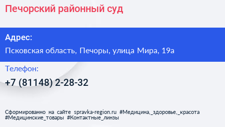 Печорский районный суд по адресу Псковская область, Печоры, улица Мира, 19а в дальнейшем Организация, размещена в следующих категориях: