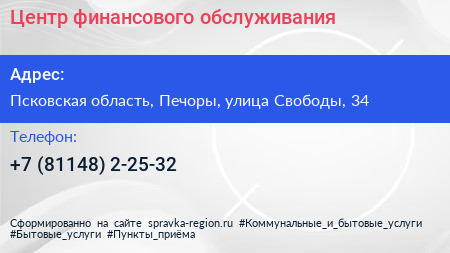 Центр финансового обслуживания по адресу Псковская область, Печоры, улица Свободы, 34 в дальнейшем Организация, размещена в следующих категориях: