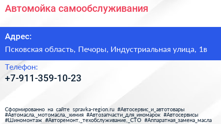Автомойка самообслуживания по адресу Псковская область, Печоры, Индустриальная улица, 1в в дальнейшем Организация, размещена в следующих категориях: