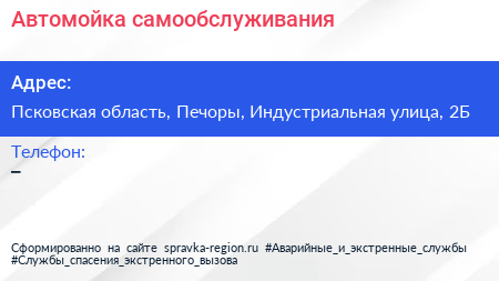 Автомойка самообслуживания по адресу Псковская область, Печоры, Индустриальная улица, 2Б в дальнейшем Организация, размещена в следующих категориях: