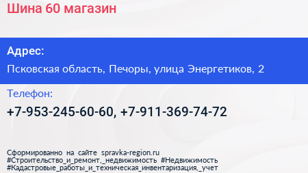 Шина 60, магазин по адресу Псковская область, Печоры, улица Энергетиков, 2 в дальнейшем Организация, размещена в следующих категориях: