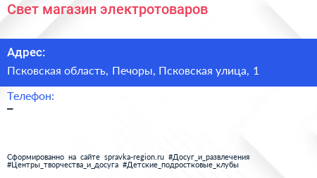 Свет, магазин электротоваров по адресу Псковская область, Печоры, Псковская улица, 1 в дальнейшем Организация, размещена в следующих категориях: