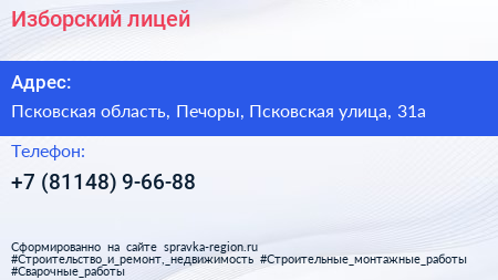 Изборский лицей по адресу Псковская область, Печоры, Псковская улица, 31а в дальнейшем Организация, размещена в следующих категориях: