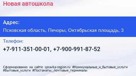 Новая автошкола по адресу Псковская область, Печоры, Октябрьская площадь, 3 в дальнейшем Организация, размещена в следующих категориях: