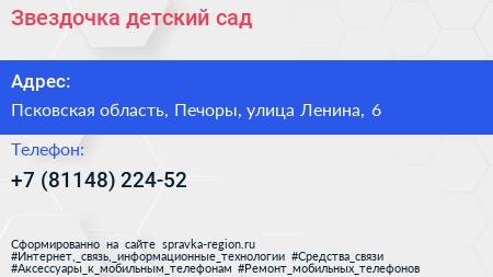 Звездочка, детский сад по адресу Псковская область, Печоры, улица Ленина, 6 в дальнейшем Организация, размещена в следующих категориях: