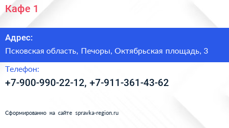 Кафе №1 по адресу Псковская область, Печоры, Октябрьская площадь, 3 в дальнейшем Организация, размещена в следующих категориях: