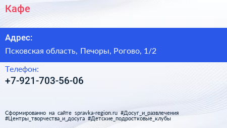 Кафе по адресу Псковская область, Печоры, Рогово, 1/2 в дальнейшем Организация, размещена в следующих категориях: