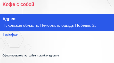 Кофе с собой по адресу Псковская область, Печоры, площадь Победы, 2а в дальнейшем Организация, размещена в следующих категориях: