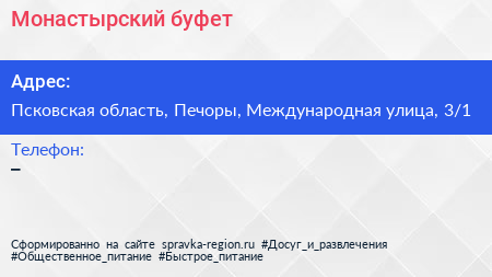 Монастырский буфет по адресу Псковская область, Печоры, Международная улица, 3/1 в дальнейшем Организация, размещена в следующих категориях: