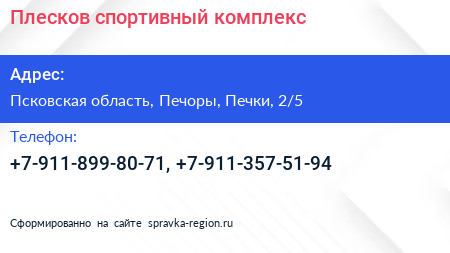 Плесков, спортивный комплекс по адресу Псковская область, Печоры, Печки, 2/5 в дальнейшем Организация, размещена в следующих категориях:
