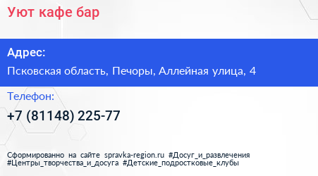 Уют, кафе-бар по адресу Псковская область, Печоры, Аллейная улица, 4 в дальнейшем Организация, размещена в следующих категориях: