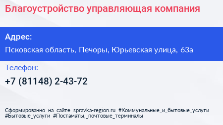 Благоустройство, управляющая компания по адресу Псковская область, Печоры, Юрьевская улица, 63а в дальнейшем Организация, размещена в следующих категориях:
