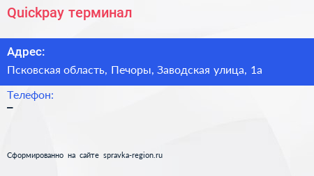 Quickpay, терминал по адресу Псковская область, Печоры, Заводская улица, 1а в дальнейшем Организация, размещена в следующих категориях: