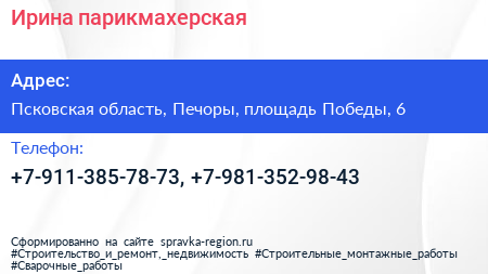Ирина, парикмахерская по адресу Псковская область, Печоры, площадь Победы, 6 в дальнейшем Организация, размещена в следующих категориях: