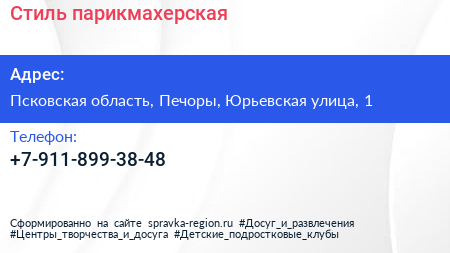 Стиль, парикмахерская по адресу Псковская область, Печоры, Юрьевская улица, 1 в дальнейшем Организация, размещена в следующих категориях: