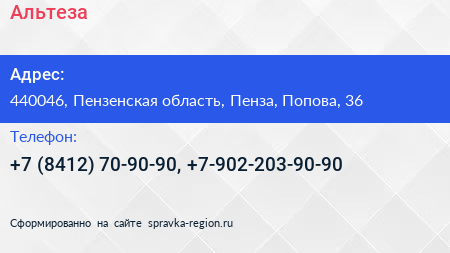 Альтеза по адресу 440046, Пензенская область, Пенза, Попова, 36 в дальнейшем Организация, размещена в следующих категориях: