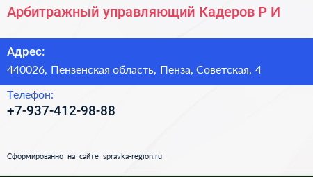 Арбитражный управляющий Кадеров Р.И. по адресу 440026, Пензенская область, Пенза, Советская, 4 в дальнейшем Организация, размещена в следующих категориях: