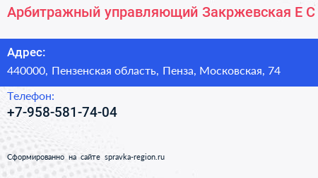 Арбитражный управляющий Закржевская Е.С. по адресу 440000, Пензенская область, Пенза, Московская, 74 в дальнейшем Организация, размещена в следующих категориях: