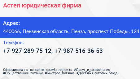 Астея, юридическая фирма по адресу 440066, Пензенская область, Пенза, проспект Победы, 124 в дальнейшем Организация, размещена в следующих категориях: