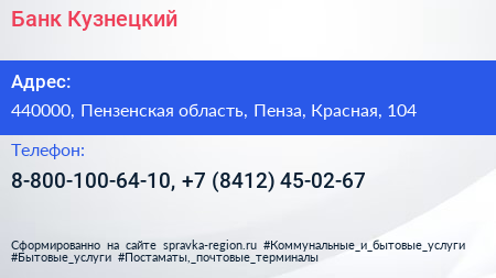 Банк Кузнецкий по адресу 440000, Пензенская область, Пенза, Красная, 104 в дальнейшем Организация, размещена в следующих категориях: