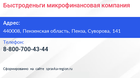 Быстроденьги, микрофинансовая компания по адресу 440008, Пензенская область, Пенза, Суворова, 141 в дальнейшем Организация, размещена в следующих категориях:
