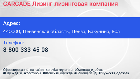 CARCADE Лизинг, лизинговая компания по адресу 440000, Пензенская область, Пенза, Бакунина, 80а в дальнейшем Организация, размещена в следующих категориях:
