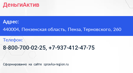 ДеньгиАктив по адресу 440004, Пензенская область, Пенза, Терновского, 260 в дальнейшем Организация, размещена в следующих категориях: