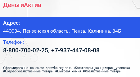 ДеньгиАктив по адресу 440034, Пензенская область, Пенза, Калинина, 84Б в дальнейшем Организация, размещена в следующих категориях: