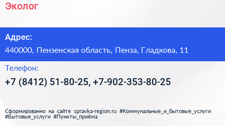 Эколог по адресу 440000, Пензенская область, Пенза, Гладкова, 11 в дальнейшем Организация, размещена в следующих категориях: